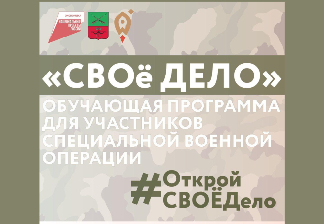 «СВОё дело» — это федеральная программа поддержки, разработанная специально для участников специальной военной операции и членов их семей. Полноценный обучающий курс, который поможет успешно запустить и развить собственное дело.